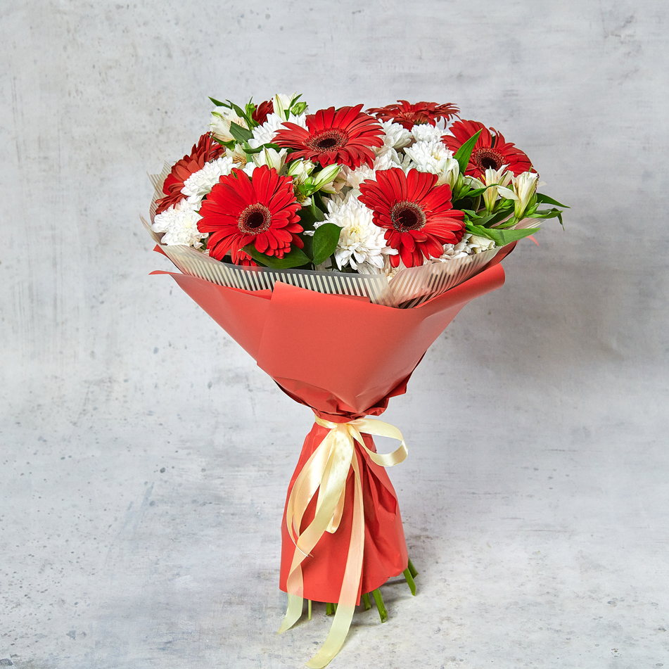 Насыщенный красный и белоснежная хризантема - беспроигрышное сочетание, так любимое многими. Букет подойдет ярким, энергичным личностям, любящим эффектные жесты. Возможны небольшие изменения элементов. Общий вид и композиция букета будет сохранена.
