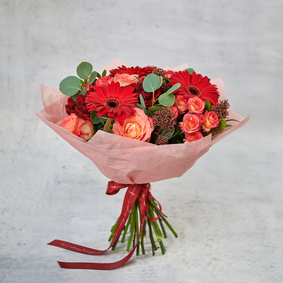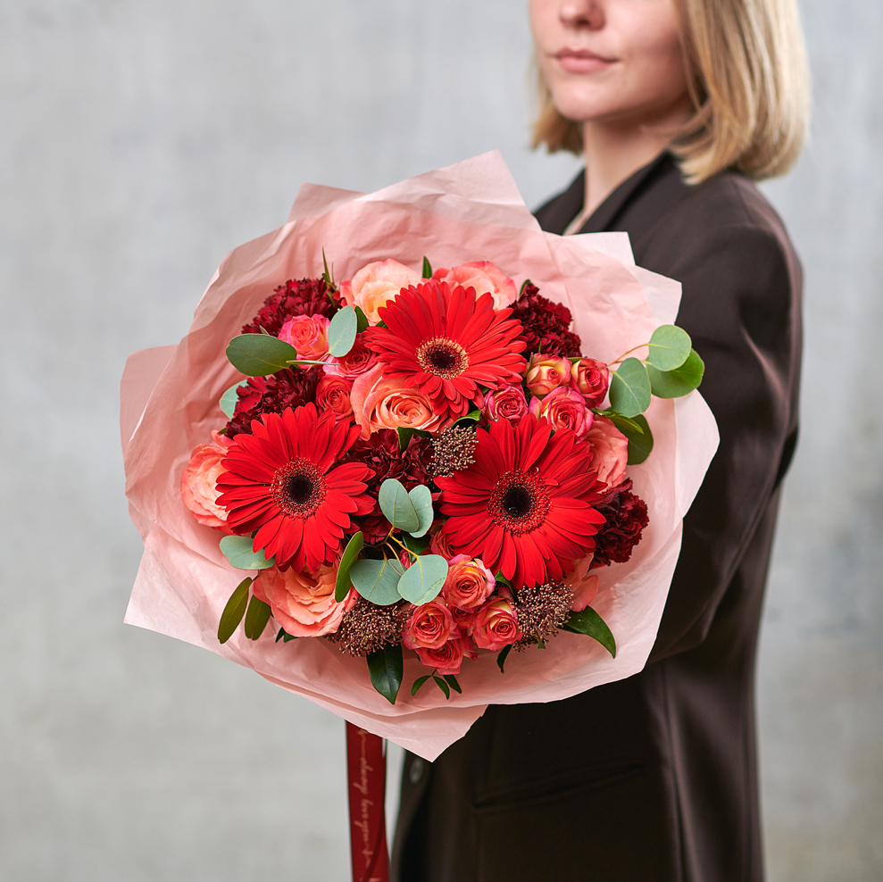 Яркие герберы, оттененные глубокими оттенками скимии идеальны для осеннего сезона и всех любителей пунцовых элементов. Возможны небольшие изменения элементов. Общий вид и композиция букета будет сохранена.