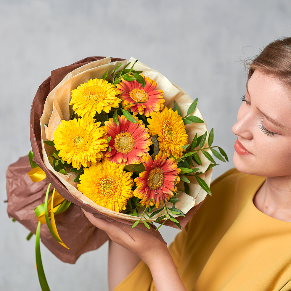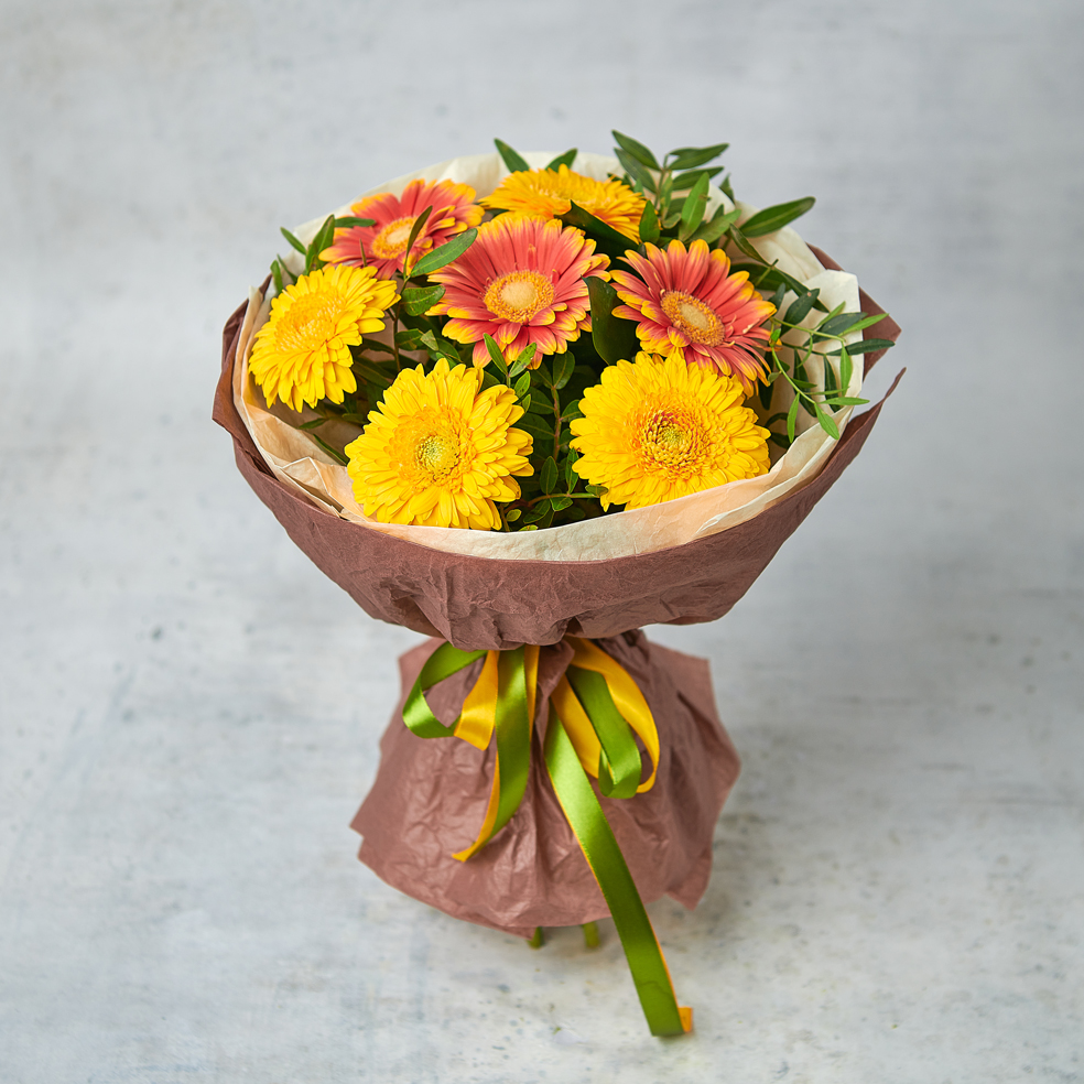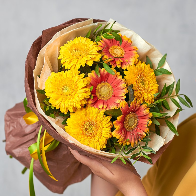 Букет из солнечных африканских ромашек моментально подарит радость и зарядит энергией на весь день. Идеальная круглая упаковка подчеркнет форму каждого цветка, а натуральные оттенки придадут роскоши и монументальности. Возможны небольшие изменения элементов. Общий вид и композиция букета будет сохранена.
