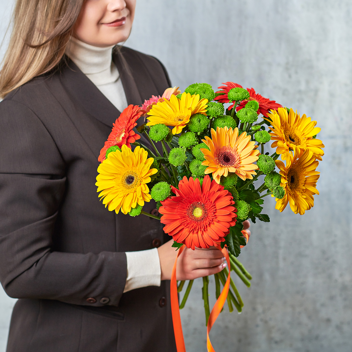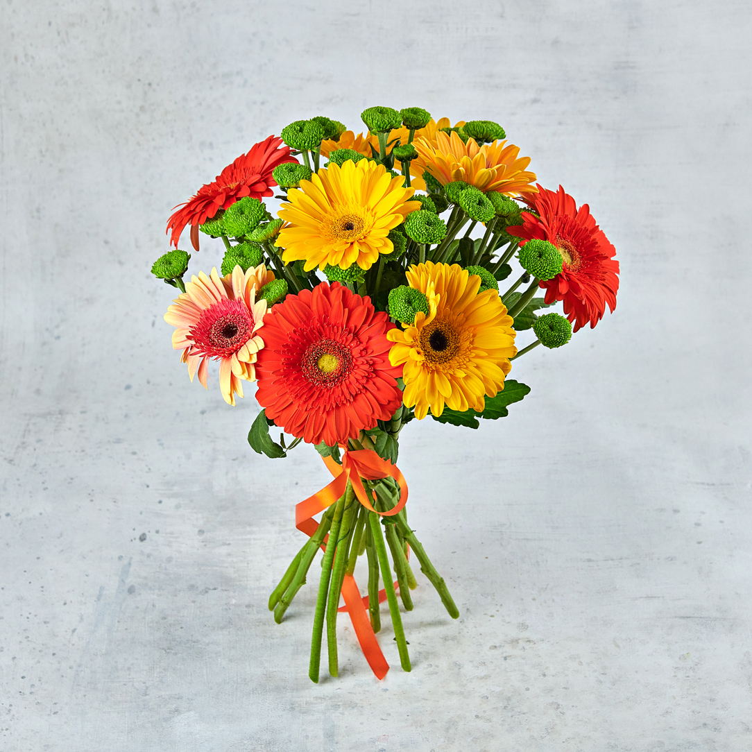 Настоящее цитрусовое наслаждение для любителей ярких цветов и задорного настроения. Африканские солнечные ромашки и хрустящая хризантема точно подарят ощущение праздника на долго время.Возможны небольшие изменения элементов. Общий вид и композиция букета будет сохранена.