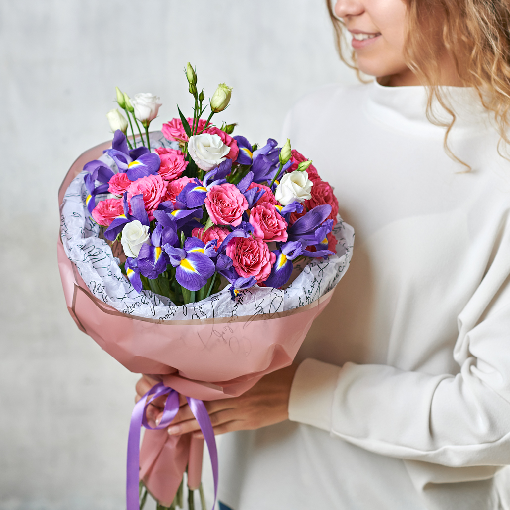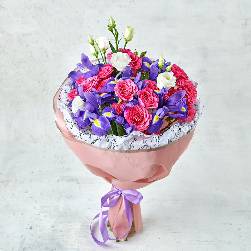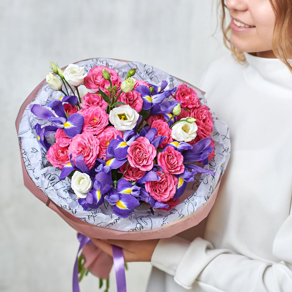 Букет из ирисов, кустовых роз и нежной эустомы в необычной круглой упаковке - словно ягодный десерт. Так и манит попробовать на вкус и запах. Ирисы - символ творчества и красоты, розы - символ любви и всего прекрасного, вместе они создадут гармоничный по фактуре и смыслу союз, подчеркнутый идеальной круглой упаковкой. Возможны небольшие изменения элементов. Общий вид и композиция букета будет сохранена.
