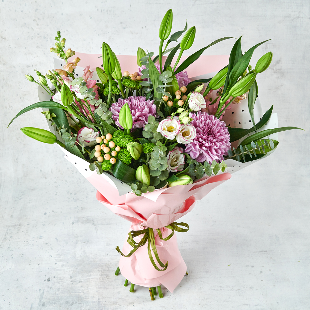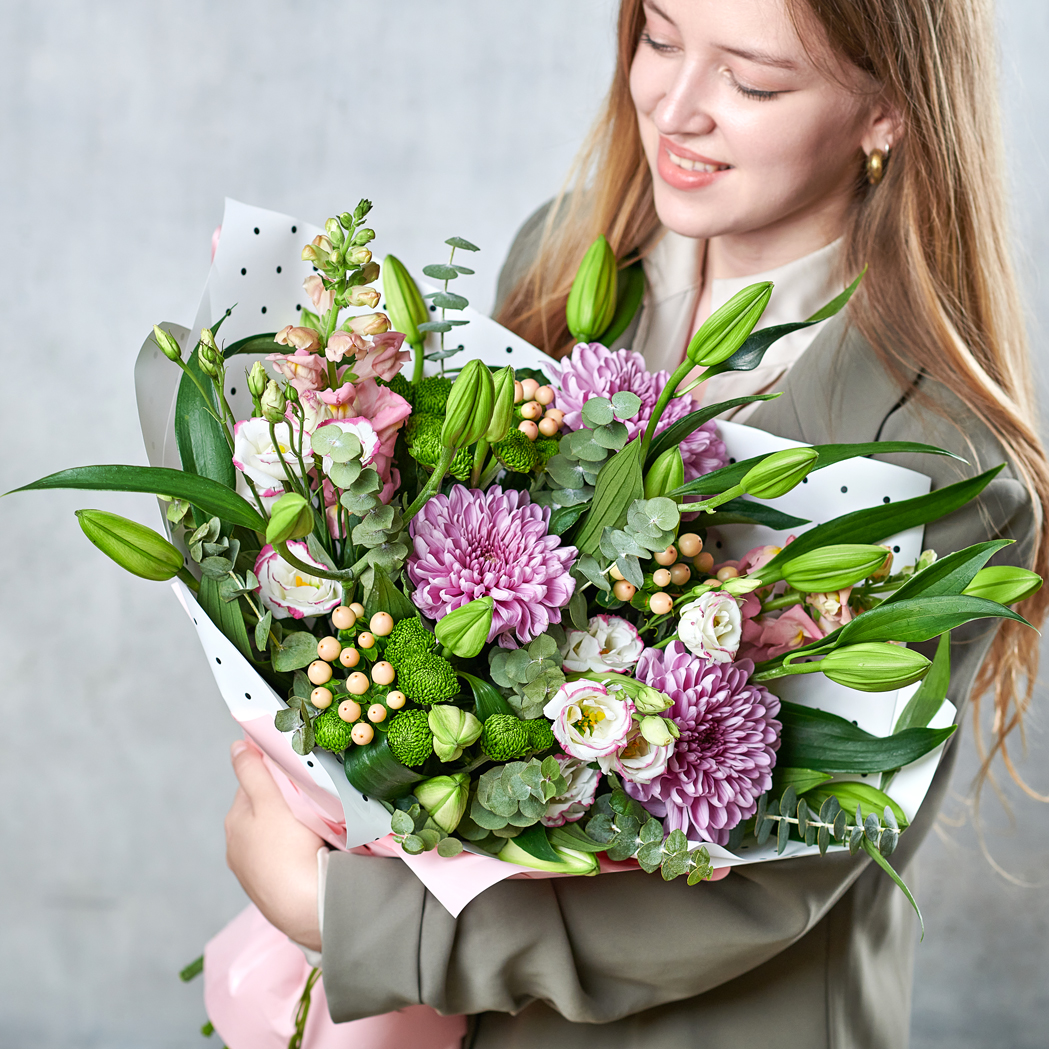 Трогательный букет из нежных хризантем, благородных лилий способен очаровать с первого взгляда. Нежный, легкий и воздушный в успокаивающих тонах станет прекрасным подарком для тех, кто любит удивлять. Возможны небольшие изменения элементов. Общий вид и композиция букета будет сохранена.