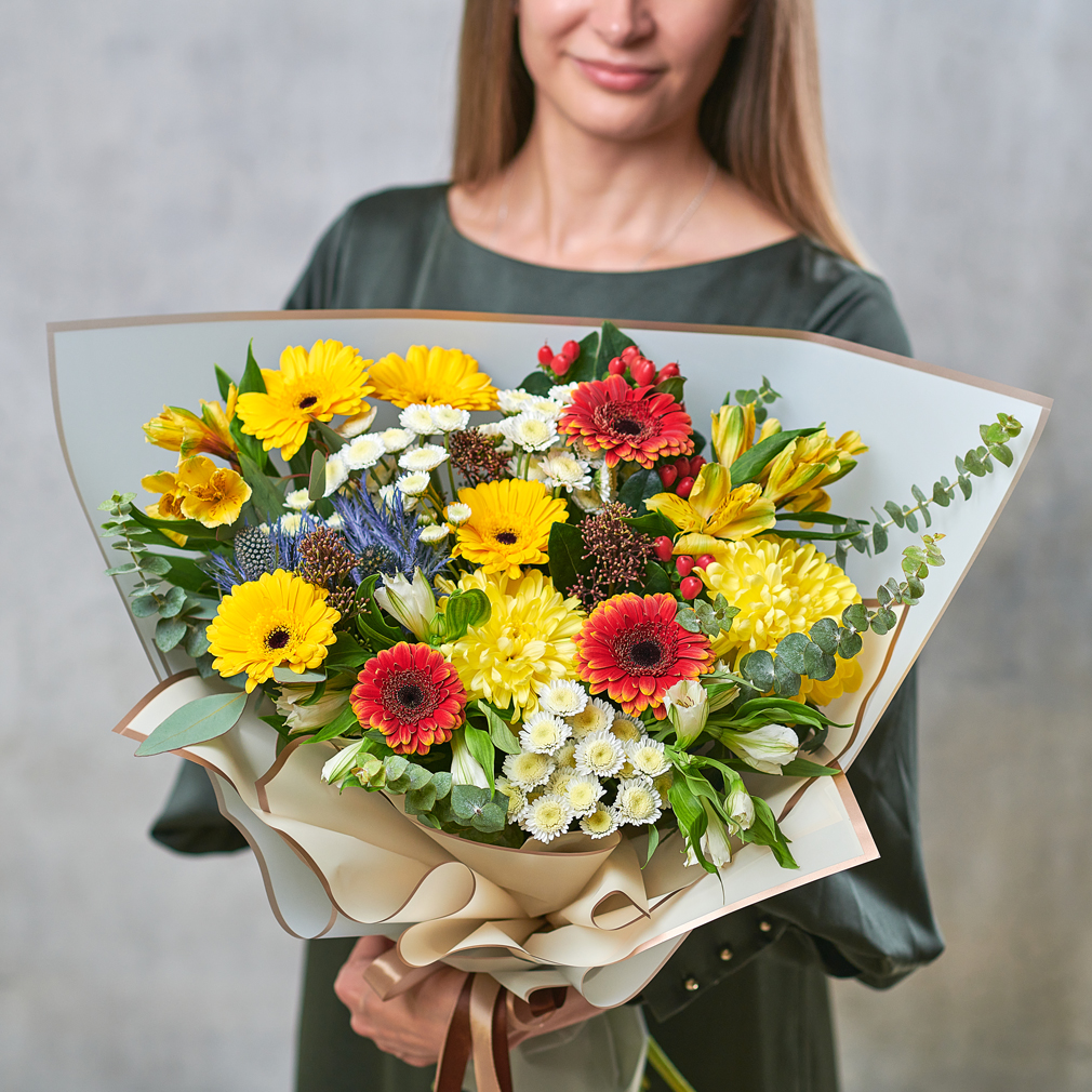 Летний ветер из цветочных ароматов собран в единый композиционный микс. Стойкий состав, яркие краски, натуральная пышная упаковка, - смогут порадовать ценителей природных ландшафтов и необычных форм. Возможны небольшие изменения элементов. Общий вид и композиция букета будет сохранена.