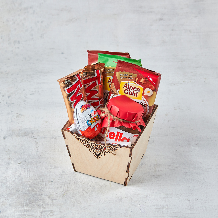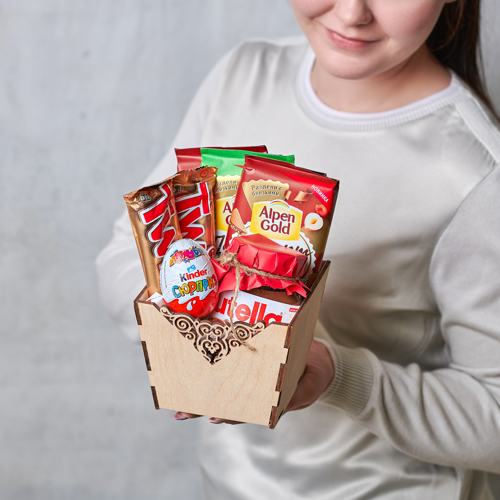 О чем мечтаете вы в самых сладких снах? Конечно же о миксе из шоколада. Заботливый подарок, который будет уместен всегда. Возможны небольшие изменения элементов. Общий вид и композиция букета будет сохранена.