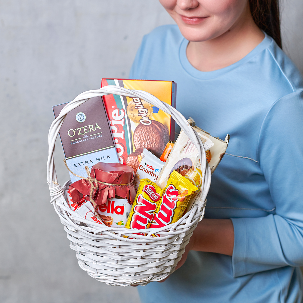 Корзина шоколадных сладостей - мечта каждой сладкоежки. Подарок, который заставит улыбнуться даже взрослых. Возможны небольшие изменения элементов. Общий вид и композиция букета будет сохранена.