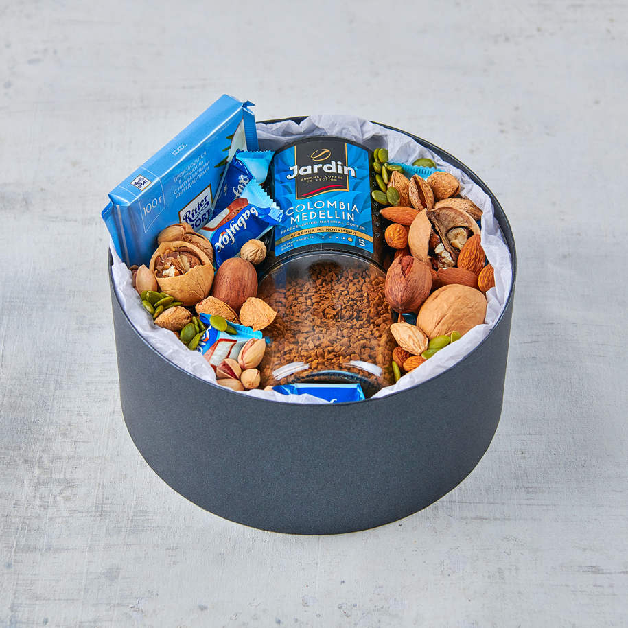 Взбодрить утром может чашечка кофе и сладкий подарок в красивом оформлении. Кофе придаст сил, а ореховый микс поможет поддержать энергию в течении всего дня. Возможны небольшие изменения элементов. Общий вид и композиция букета будет сохранена.
