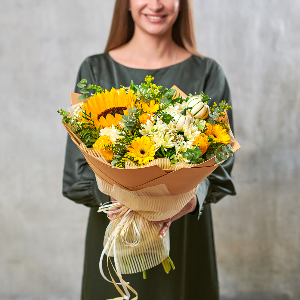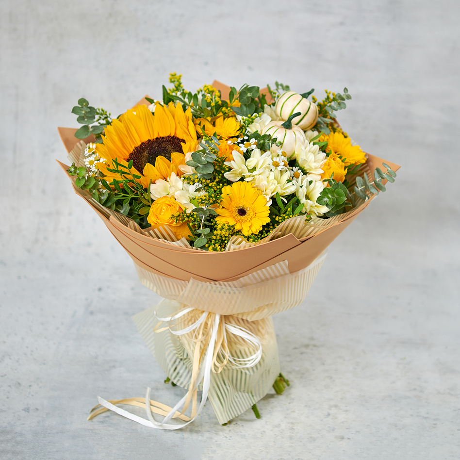 Золотые лепестки, поцелованные солнцем, нежная зелень и классическая упаковка. Грациозное сочетание, которое создаст атмосферу летней сиесты, романтичного свидания и наполнит энергией на долгое время. Возможны небольшие изменения элементов. Общий вид и композиция букета будет сохранена.В составе присутствует сезонный цветок, который может быть заменен, исходя из наличия товара.