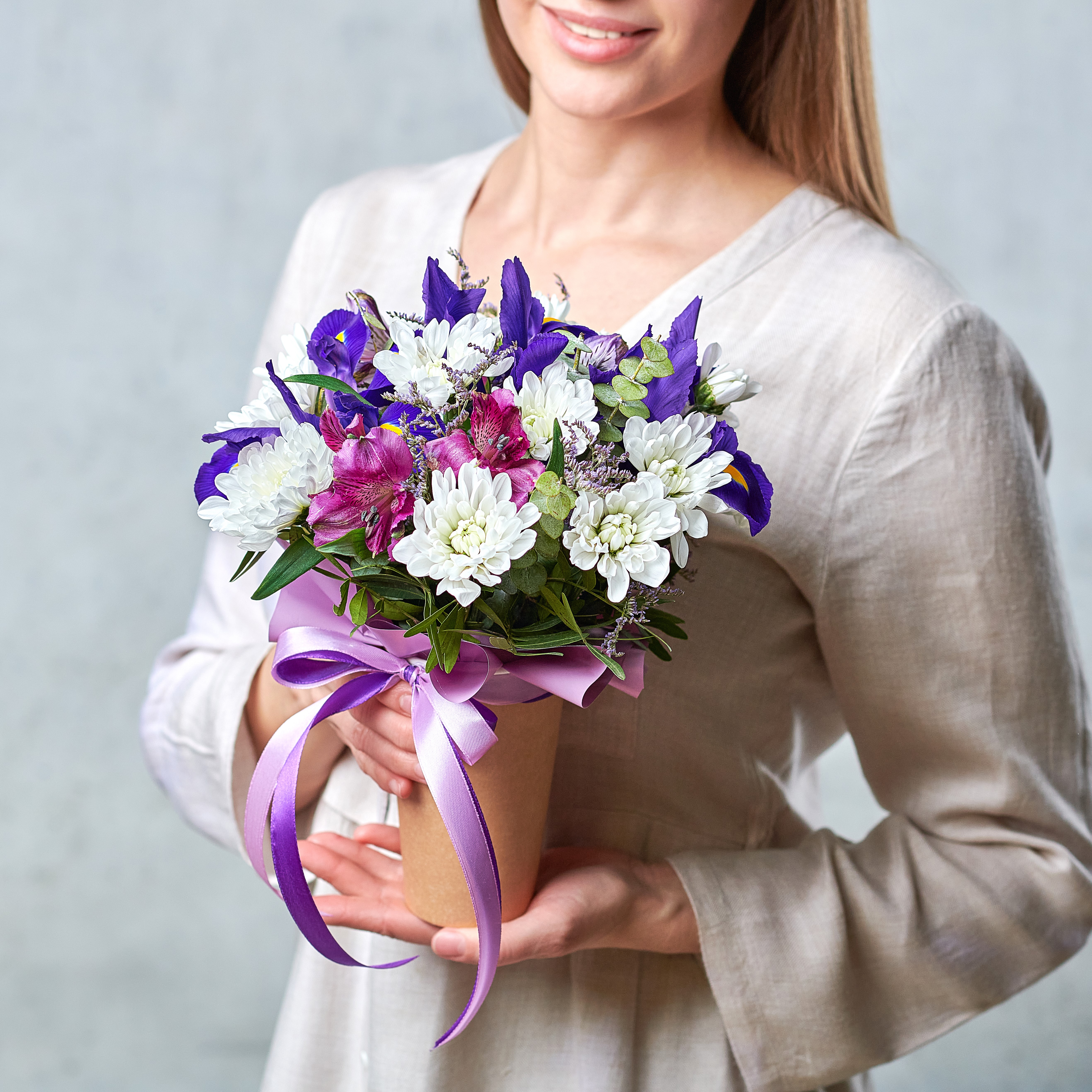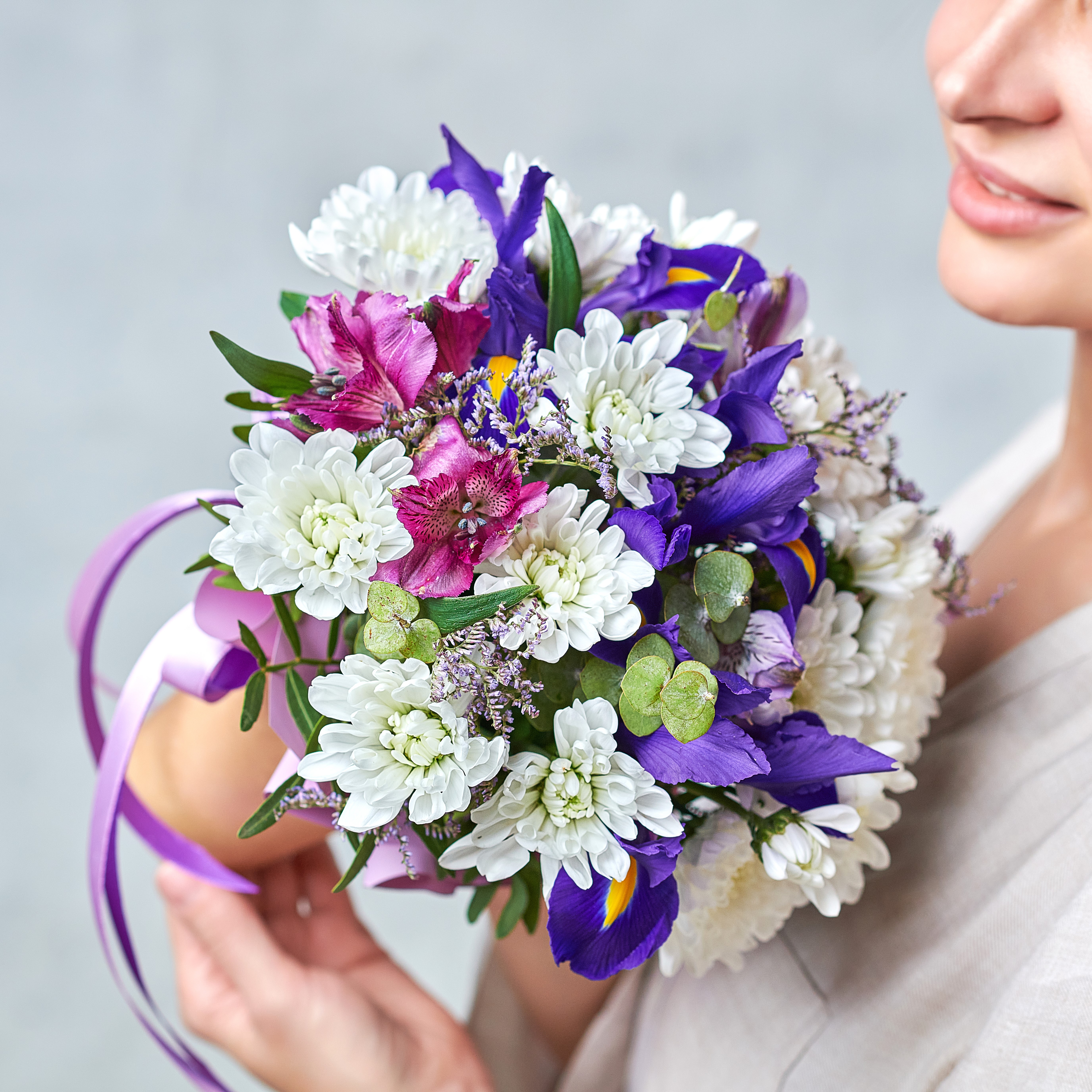 Попасть под цветочное настроение - значит влюбиться в каждую деталь. Свежесть глубоких оттенков и нежность изящных звезд хризантем создадут гармоничное сочетание для любого повода. Возможны небольшие изменения элементов. Общий вид и композиция букета будет сохранена.