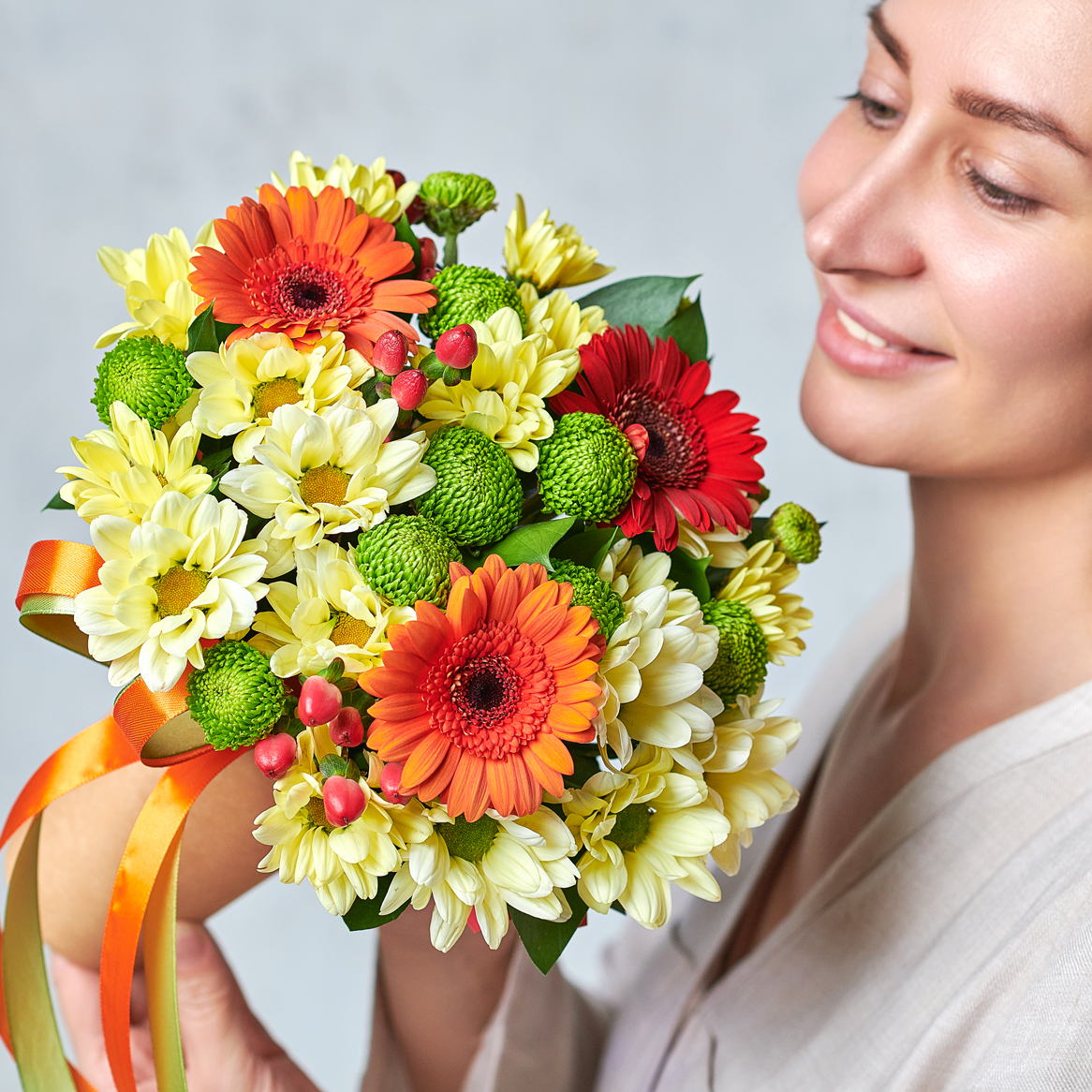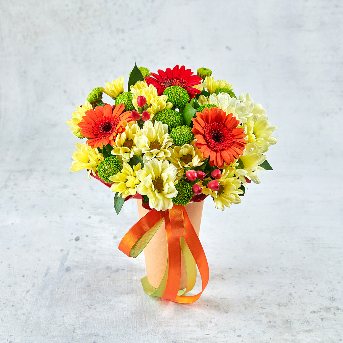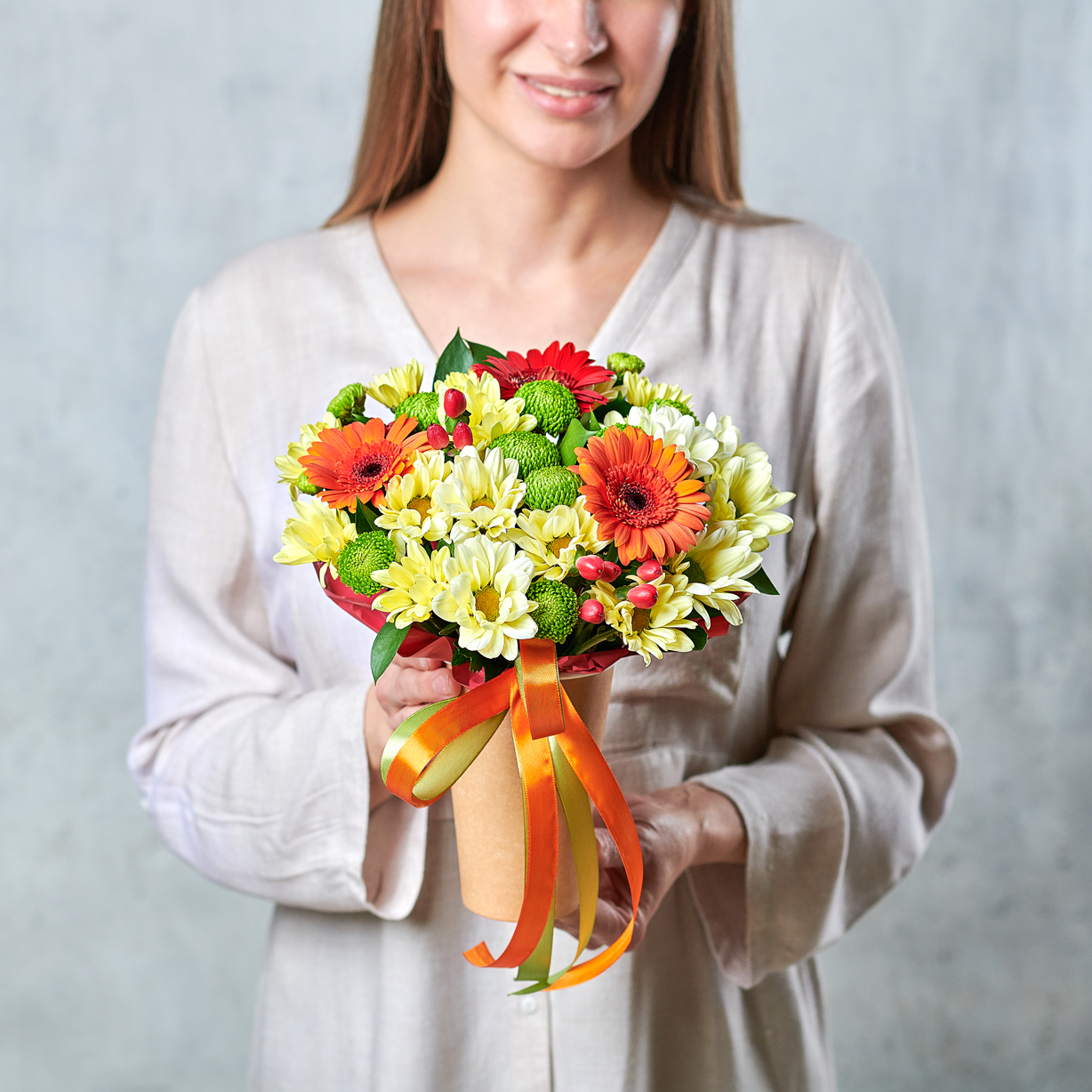 Теплые оттенки согреют не хуже ароматного кофе. Соединяйте прогулки, цветы и теплые объятья с самыми лучезарными цветами на свете. Возможны небольшие изменения элементов. Общий вид и композиция букета будет сохранена.