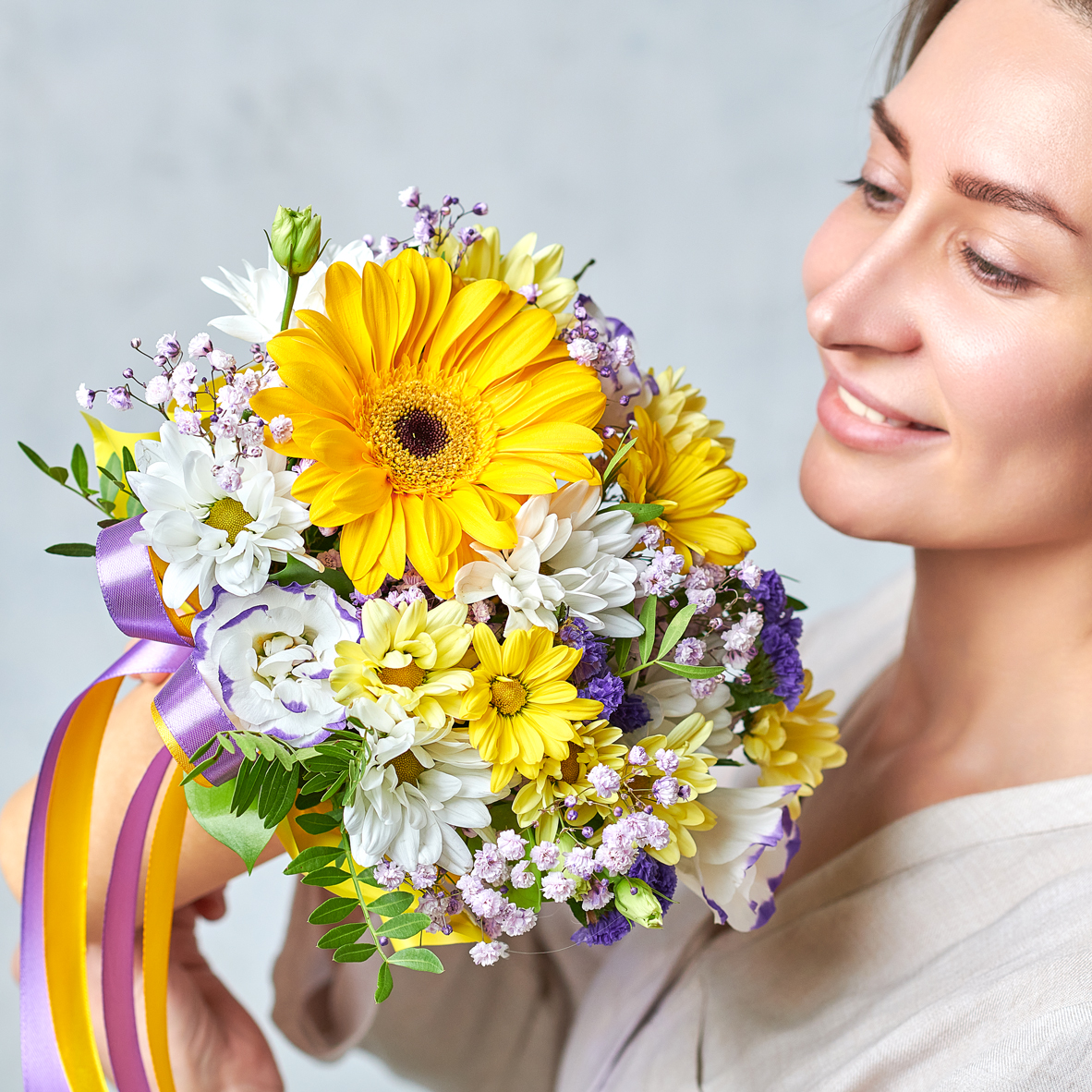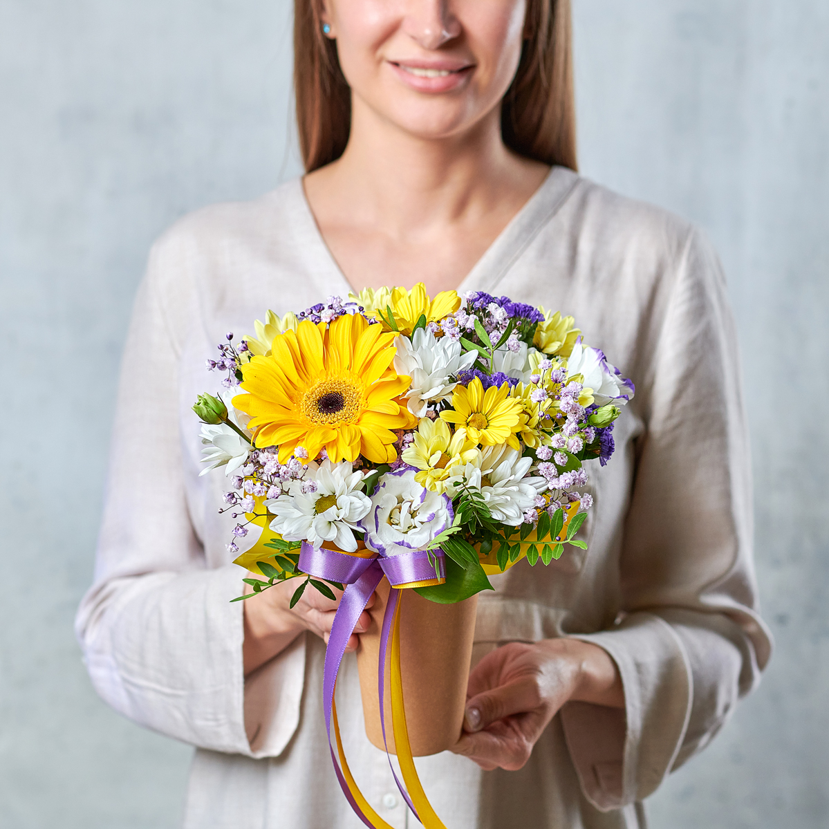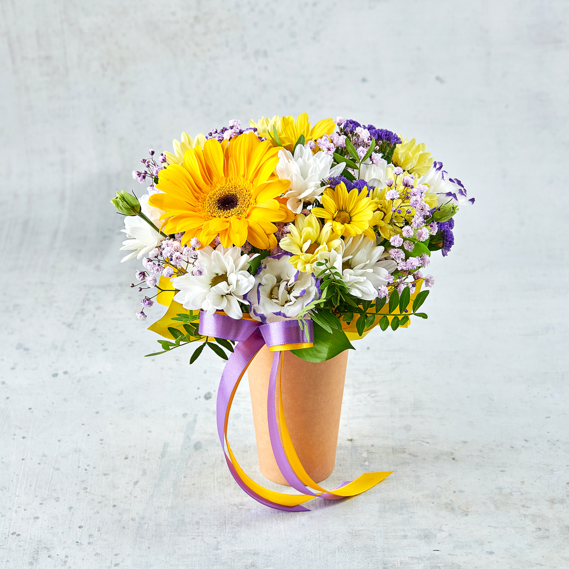 Солнечный поцелуй задорных веснушек из статицы, ярких лучей из лепестков герберы станет прекрасным презентом для подарка без повода. Возможны небольшие изменения элементов. Общий вид и композиция букета будет сохранена.