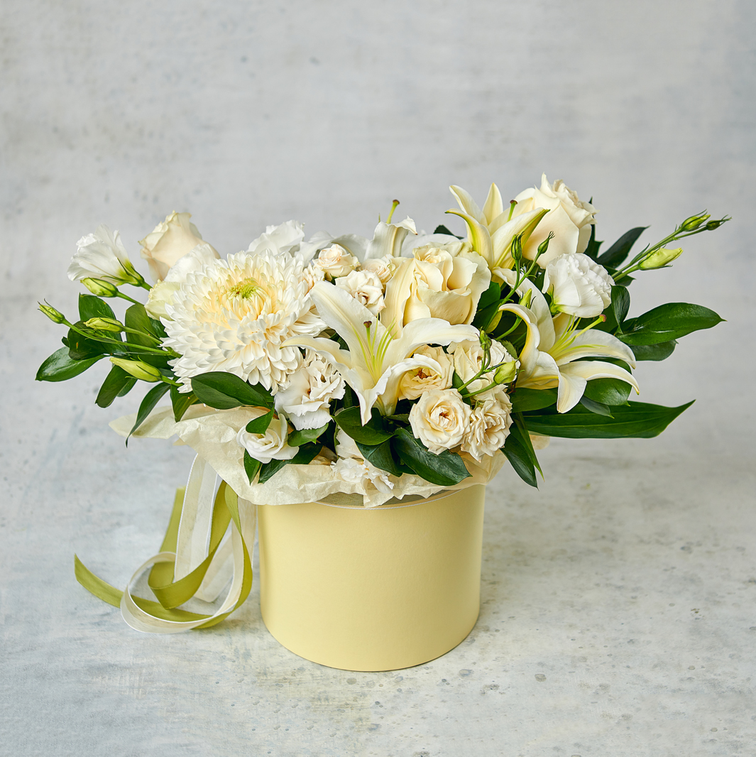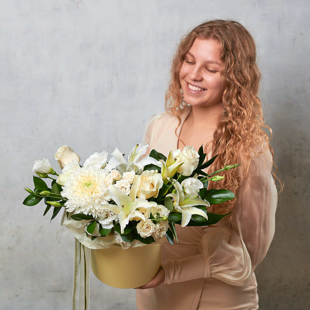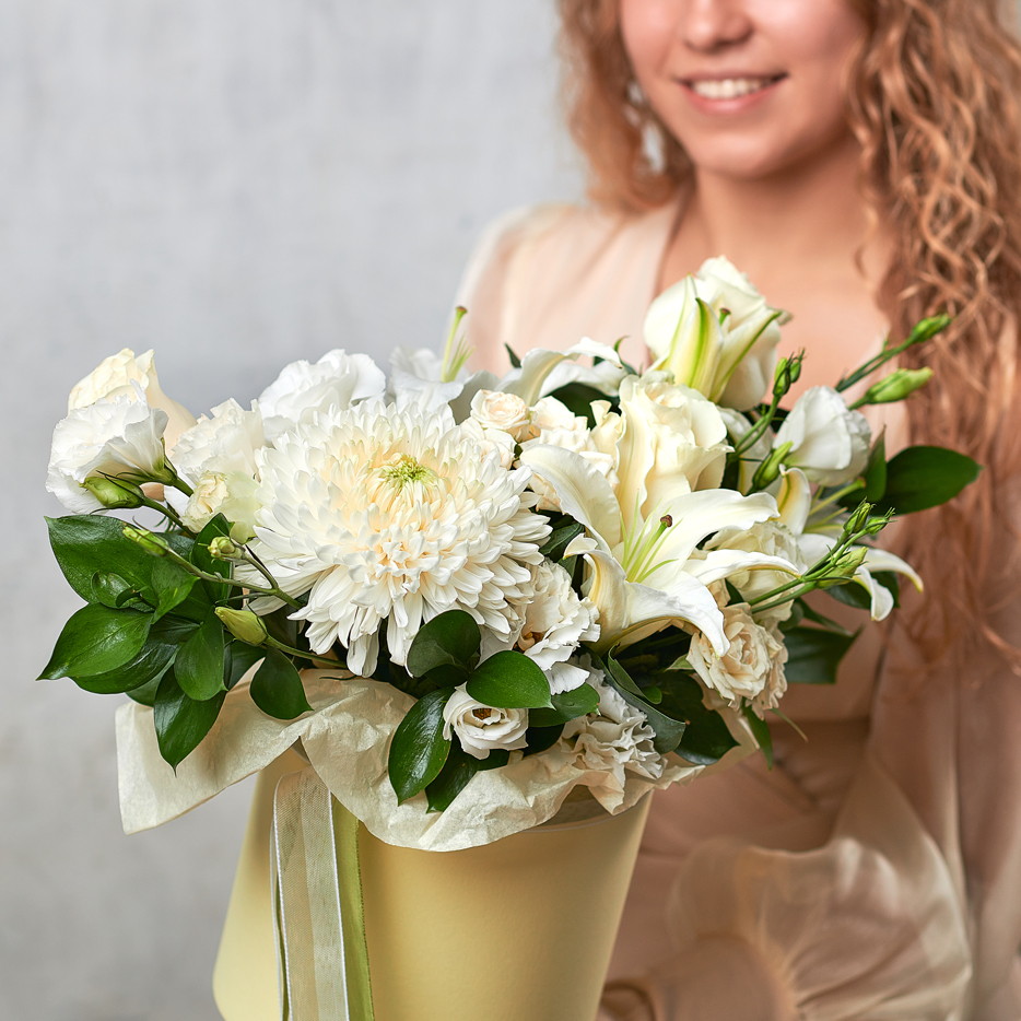 Шелест ветра и тонкий аромат белых цветов. Такая стойкая нежность придется по вкусу каждой. Возможны небольшие изменения элементов. Общий вид и композиция букета будет сохранена.