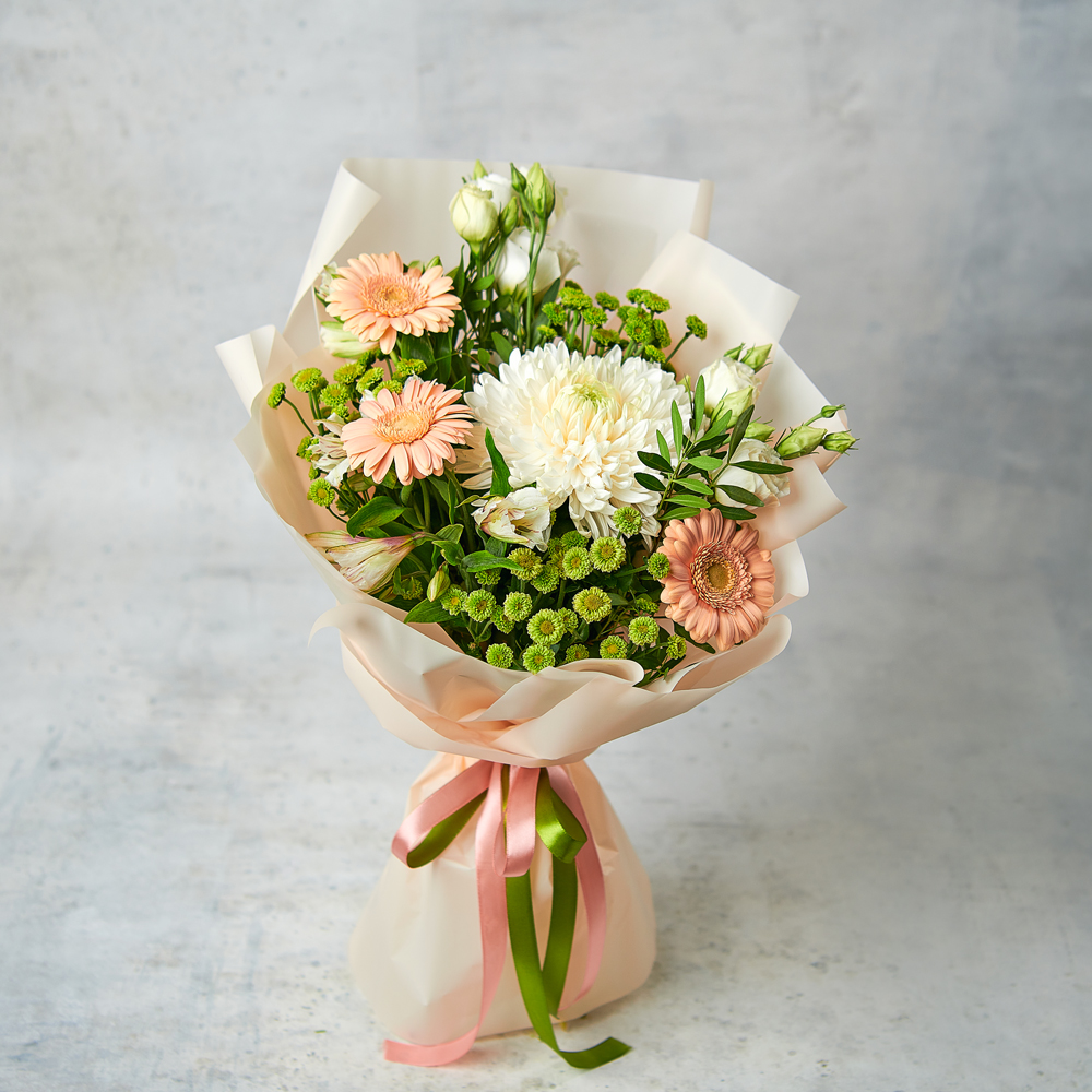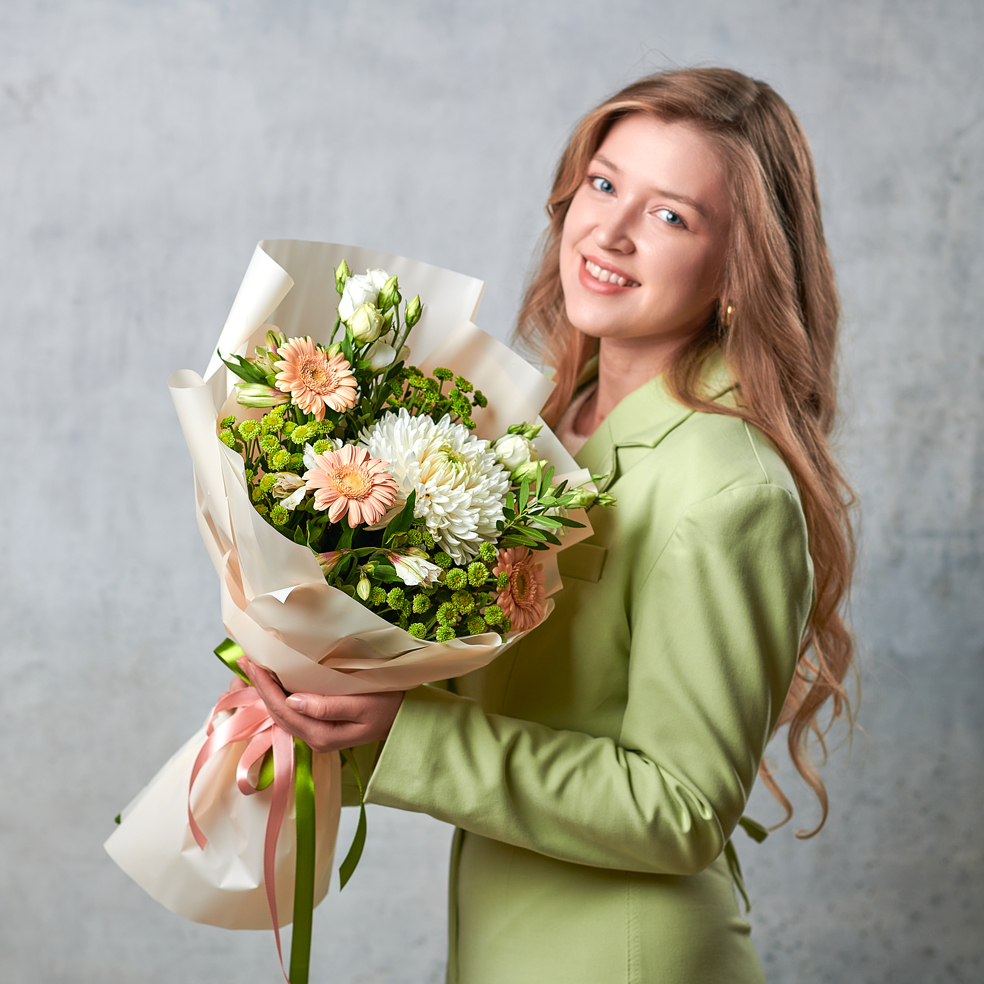 Нежная гамма, подчеркнутая зеленой свежестью создает неповторимый летний этюд. Такой букет поможет подарить улыбку и напомнить о счастливых летних днях. Возможны небольшие изменения элементов. Общий вид и композиция букета будет сохранена.