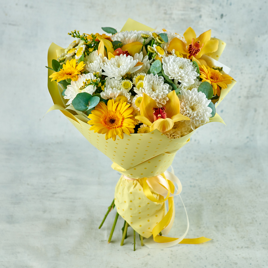 Желтая жизнерадостная палитра, необычный состав и море цветочных эмоций. Букет для тех, кто любит улыбки, солнце и звонкий смех. Возможны небольшие изменения элементов. Общий вид и композиция букета будет сохранена.