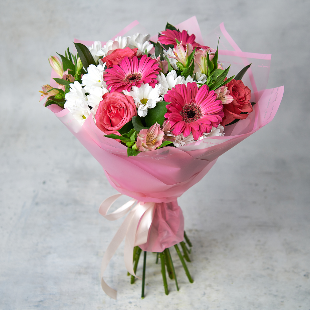 Цветочная грация - это когда каждый цветок поражает оттенком и формой. Воздушная пышная упаковка, бело-розовая гамма - классика, которая подчеркнет изящность и красоту любой получательницы.Возможны небольшие изменения элементов. Общий вид и композиция букета будет сохранена.